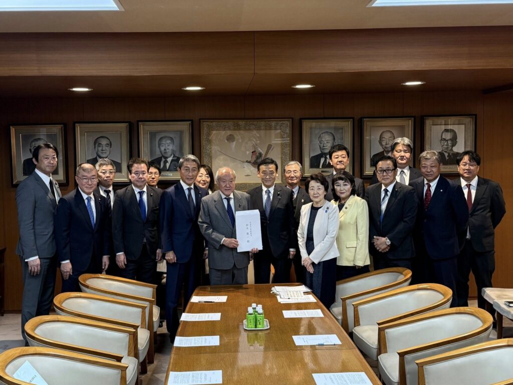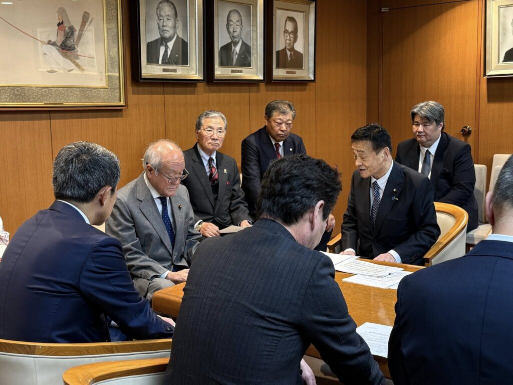 ここでは、本会はじめ5つの介護関係団体が同行の上で、自由民主党の鈴木俊一幹事長に面会し、「新たな経済対策(補正予算)や期中改定等を通じた介護・福祉分野への大胆な支援策の早期実現について」とする申入れ書を手交。▽全産業平均と介護職員の賃金格差がさらに拡がっていること、▽令和7年春闘における賃上げ率に対し、介護分野の賃上げ率が大きく低い現状にあること、▽最低賃金の過去最大幅の引き上げがされたことに対し、約7割の介護事業者が懸念を示している状況であること、▽物価高騰により介護事業経営が著しく圧迫されていること等の問題意識をもとに、「新たな経済対策(補正予算)や、期中の報酬改定等を通じた介護・福祉分野への大胆な支援策を早期に実現していただきたい」と求めました。