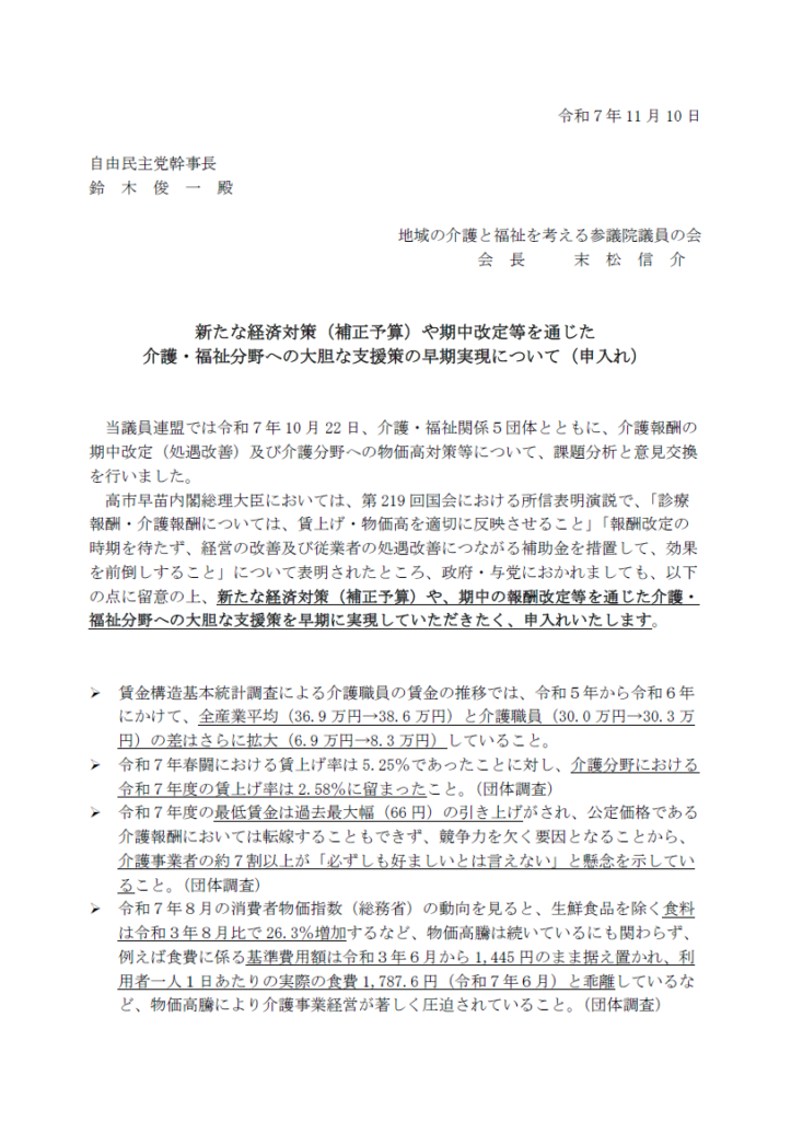 〇自民議連、介護・福祉現場への大胆な支援策を要請 経済対策の駆け引き本格化(介護ニュースJoint 2025年11月10日)