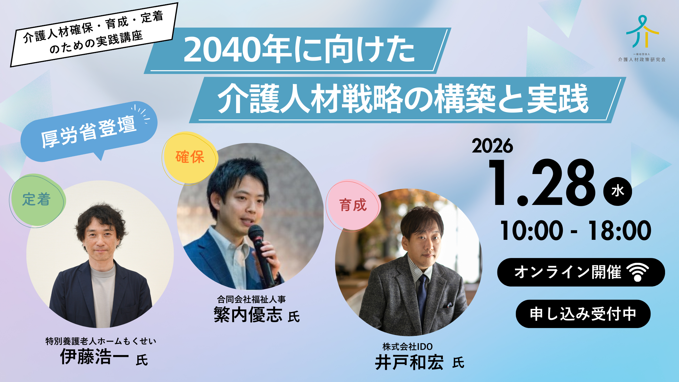 当講座でお届けする、3つのテーマ(「確保」・「育成」・「定着」)に係るトップクラスの講師陣からの講演・ワーク、そして厚生労働省(福祉人材確保対策室)による直近の行政情報により、ぜひ皆さまの施設・事業所における人材戦略構築にお役立てください。